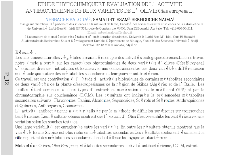 Les substances naturelles végétales se caractérisent par des activité s biologiques diverses. Dans ce travail notre étude a porté sur les caractères phytochimiques de deux variétés d'olives (Olea Europeae.) d' origines diverses: introduites et localesavec une comparaisonentre ces deux variétés différentespar une étude qualitative des métabolites secondaires et leur pouvoir antibactérien.
