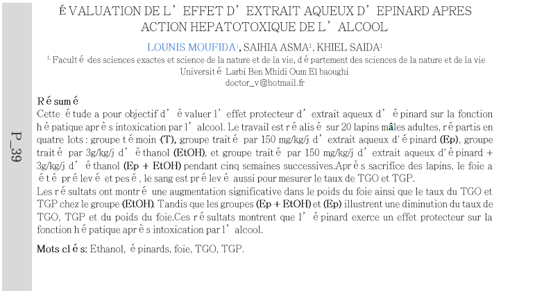Les résultats ont montré une augmentation significative dans le poids du foie ainsi que le taux du TGO et TGP chez le groupe (EtOH). Tandis que les groupes (Ep + EtOH) et (Ep) illustrent une diminution du taux de TGO, TGP et du poids du foie.Ces résultats montrent que l'épinard exerce un effet protecteur sur la fonction hépatique après intoxication par l' alcool.