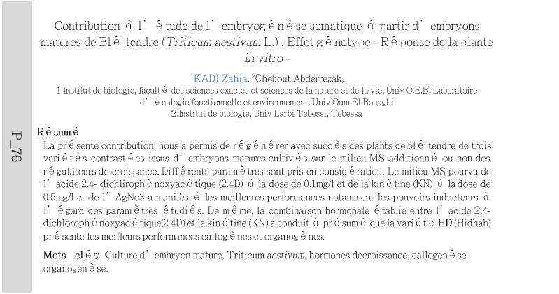 La présente contribution, nous a permis de régénérer avec succès des plants de blé tendre de trois variétés contrast é es issus d' embryons matures cultivés sur le milieu MS additionné ou non-des régulateurs de croissance. Différents paramè tres sont pris en consid é ration. Le milieu MS pourvu de l'acide 2.4-dichlirophé noxyac é tique (2.4D) à la dose de 0.1mg/l et de la kin é tine (KN) à la dose de 0.5mg/l et de l' AgNo3 a manifesté les meilleures performances notamment les pouvoirs inducteurs à l'égard des paramè tres étudiés. De même, la combinaison hormonale établie entre l'acide 2.4- dichlorophé noxyac é tique(2.4D) et la kin é tine (KN) a conduit à présumé que la variété HD (Hidhab) présente les meilleurs performances callog è nes et organogènes.