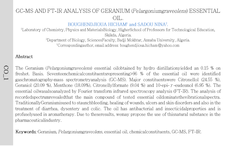 GC-MS AND FT-IR analysis of geranium (Pelargoniumgraveolens) essential oil.