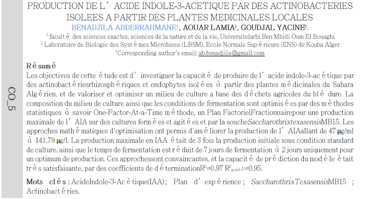 Les objectives de cette étude est d' investiguer la capacité de produire de l'acide indole-3-ac é tique par des actinobactériesrhizosphériques et endophytes isol é es à partir des plantes médicinales du Sahara Algérien, et de valoriser et optimiser un milieu de culture a base des déchets agricoles du blé dure. La composition du milieu de culture ainsi que les conditions de fermentation sont optimis é es par des méthodes statistiques à savoir One-Factor-At-a-Time méthode, un Plan FactorielFractionnairepour une production maximale de l' AIA sur des cultures fermé es et agit é es et par la soucheSaccharothrixtexasensisMB15. Les approches mathématiques d'optimisation ont permis d'améliorer la production de l' AIAallant de 47 μg/ml à 141,79 μg/l. La production maximale en IAA était de 3 fois la production initiale sous condition standard de culture, ainsi que le temps de fermentation est réduit de 7 jours de fermentation à 2 jours uniquement pour un optimum de production. Ces approchessont convaincantes, et la capacité de prédiction du modèle é tait très satisfaisante, par des coefficients de dé terminationR-0,97 R2 ajusté=0.95.