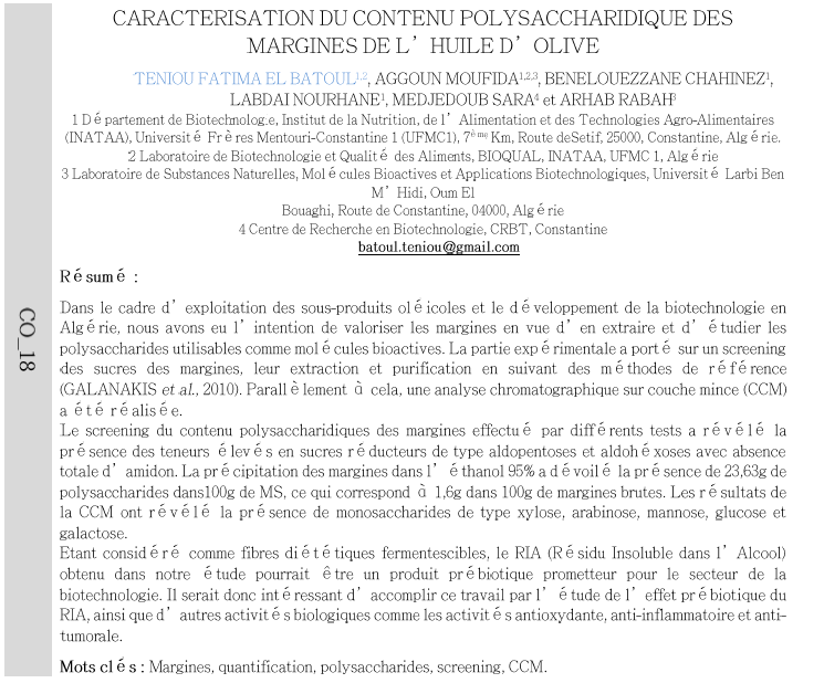 Caracterisation du contenu polysaccharidique des margines de l' huile d' olive
