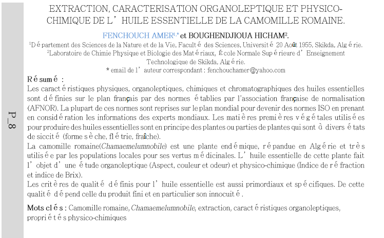 La camomille romaine(Chamaemelumnobile) est une plante endémique, répandue en Algérie et très utilisée par les populations locales pour ses vertus médicinales. L'huile essentielle de cette plante fait l'objet d'une étude organoleptique (Aspect, couleur et odeur) et physico-chimique (Indice de ré fraction et indice de Brix).