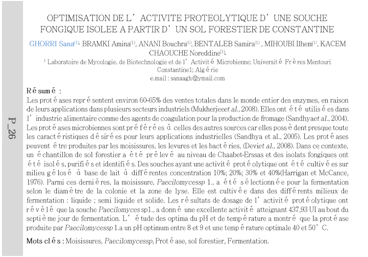 Les proté ases représentent environ 60-65% des ventes totales dans le monde entier des enzymes, en raison de leurs applications dans plusieurs secteurs industriels (Mukherjeeet al., 2008). Elles ont été utilisé es dans l' industrie alimentaire comme des agents de coagulation pour la production de fromage (Sandhyaet al., 2004). Les proté ases microbiennes sont préférées à celles des autres sources car elles poss è dent presque toute les caractéristiques dé sir é es pour leurs applications industrielles (Sandhya et al., 2005). Les proté ases peuvent être produites par les moisissures, les levures et les bactéries, (Deviet al., 2008). Dans ce contexte, un échantillon de sol forestier a été prélevé au niveau de Chaabet-Erssas et des isolats fongiques ont été isolés, purifiés et identifiés. Des souches ayant une activité proté olytique ont été cultivé es sur milieu gélos é à base de lait à différentes concentration 10%; 20%; 30% et 40% (Harrigan et McCance, 1976). Parmi ces dernières, la moisissure, Paecilomycessp 1., a été sélectionnée pour la fermentation selon le diamètre de la colonie et la zone de lyse. Elle est cultivée dans des différents milieux de fermentation: liquide; semi liquide et solide. Les résultats de dosage de l'activité proté olytique ont révélé que la souche Paecilomyces spl., a donné une excellente activité atteignant 437,93 UI au bout du septi è me jour de fermentation. L'étude des optima du pH et de température a montré que la prot é ase produite par Paecilomycessp 1.a un pH optimum entre 8 et 9 et une température optimale 40 et 50° C.