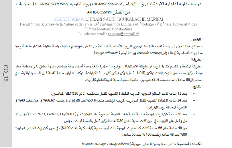 (APHIS GOSSYPII)على الحشرات من القطن (SAUGE OFFICINALE)وزيت المرمية (LAVANDE SAUVAGE)دراسة مقارنة لفاعلية الإبادة لدى زيت الخزامى