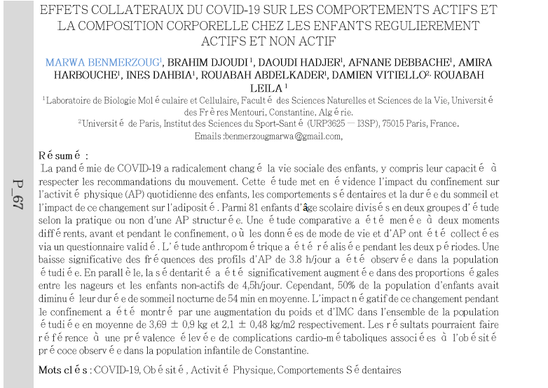 La pandémie de COVID-19 a radicalement changé la vie sociale des enfants, y compris leur capacité à respecter les recommandations du mouvement. Cette é tude met en évidence l'impact du confinement sur l'activité physique (AP) quotidienne des enfants, les comportements s é dentaires et la durée du sommeil et l'impact de ce changement sur l'adiposité. Parmi 81 enfants d'âge scolaire divisés en deux groupes d'étude selon la pratique ou non d'une AP structurée. Une étude comparative a été menée à deux moments différents, avant et pendant le confinement, où les donné es de mode de vie et d'AP ont été collect é es via un questionnaire validé. L'étude anthropométrique a été réalisée pendant les deux périodes. Une baisse significative des fréquences des profils d'AP de 3.8 h/jour a été observée dans la population é tudi é e. En parallèle, la sé dentarité a été significativement augmentée dans des proportions égales entre les nageurs et les enfants non-actifs de 4,5h/jour. Cependant, 50% de la population d'enfants avait diminué leur durée de sommeil nocturne de 54 min en moyenne. L'impact négatif de ce changement pendant le confinement a été montré par une augmentation du poids et d'IMC dans l'ensemble de la population é tudi é e en moyenne de 3,69 ± 0,9 kg et 2,1 ±0,48 kg/m2 respectivement. Les résultats pourraient faire référence à une pré valence é levée de complications cardio-métaboliques associé es à l'obésité précoce observée dans la population infantile de Constantine.