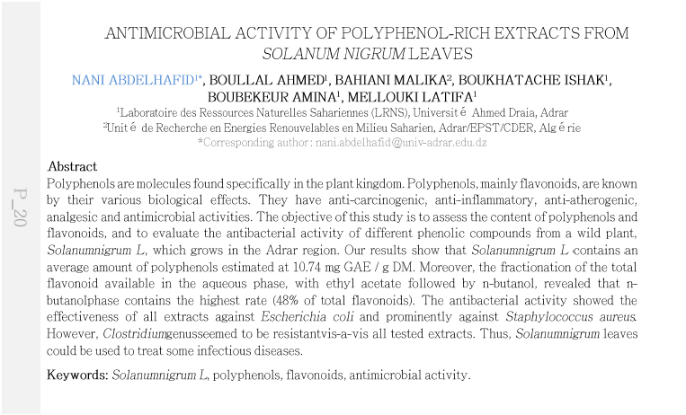| dc.description.abstract | Polyphenols are molecules found specifically in the plant kingdom. Polyphenols, mainly flavonoids, are known by their various biological effects. They have anti-carcinogenic, anti-inflammatory, anti-atherogenic, analgesic and antimicrobial activities. The objective of this study is to assess the content of polyphenols and flavonoids, and to evaluate the antibacterial activity of different phenolic compounds from a wild plant, Solanumnigrum L, which grows in the Adrar region. Our results show that Solanumnigrum L contains an average amount of polyphenols estimated at 10.74 mg GAE/g DM. Moreover, the fractionation of the total flavonoid available in the aqueous phase, with ethyl acetate followed by n-butanol, revealed that n- butanolphase contains the highest rate (48% of total flavonoids). The antibacterial activity showed the effectiveness of all extracts against Escherichia coli and prominently against Staphylococcus aureus. However, Clostridiumgenusseemed to be resistantvis-a-vis all tested extracts. Thus, Solanumnigrum leaves could be used to treat some infectious diseases. | |