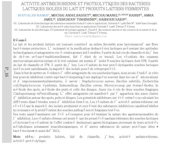 Activite antimicrobienne et proteolytiques des bacteries lactiques isolees du lait et produits laitiers fermentes