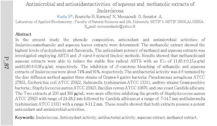 In the present study the phenolic composition, antioxidant and antimicrobial activities of Inulaviscosamethanolic and aqueous leaves extracts were determined. The methanolic extract showed the highest levels of polyphenols and flavonoids. The antioxidant potency of methanol and aqueous extracts was investigated employing ABTS and B-carot è ne/acid linoleic methods. Results showed that methanolicand aqueous extracts were able to reduce the stable free radical ABTS with an ICs of 11,85±0,15μg/ml and 10,80±0,08μg/ml, respectively. The inhibition of B-carotene bleaching of mthanolic and aqueous extracts of Inulaviscosa were about 74% and 91%, respectively. The antibacterial activity was dé termined by the disc diffusion method against three strains of Gram-négative bacteria: Pseudomonas aeruginosa ATCC 27853, Escherichia coli ATCC 25922, Salmonella typhimurium ATCC 13311, andtwo strains Gram-positive bacteria.; Staphylococcus aureus ATCC 25923, Bacillus cereus ATCC 10876, and one yeast Candida albicans. The Two extracts at 200 and 300 μg/mL were more effective inhibiting the growth of Staphylococcus aureus ATCC 25923 with range of 24-28.2 mm followed by Candida albicans at a range of 7-14.7 mm and Salmonella typhimurium ATCC 13311 with a range 9-11.2 mm. These results showed that both extracts possess a potent antioxidant and antimicrobial activities.