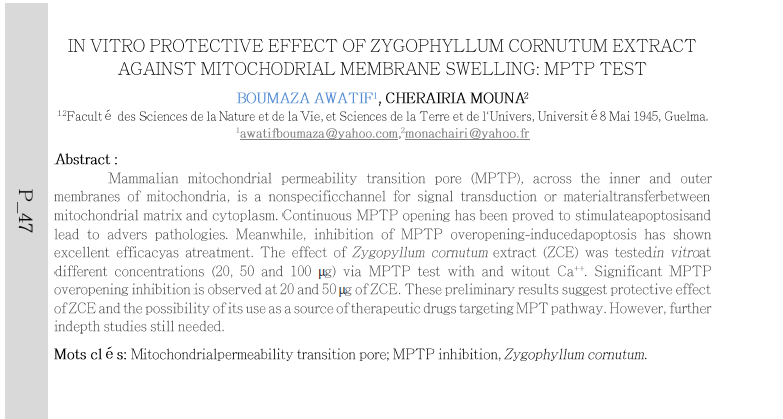In vitro protective effect of zygophyllum cornutum extract against mitochodrial membrane swelling: mptp test