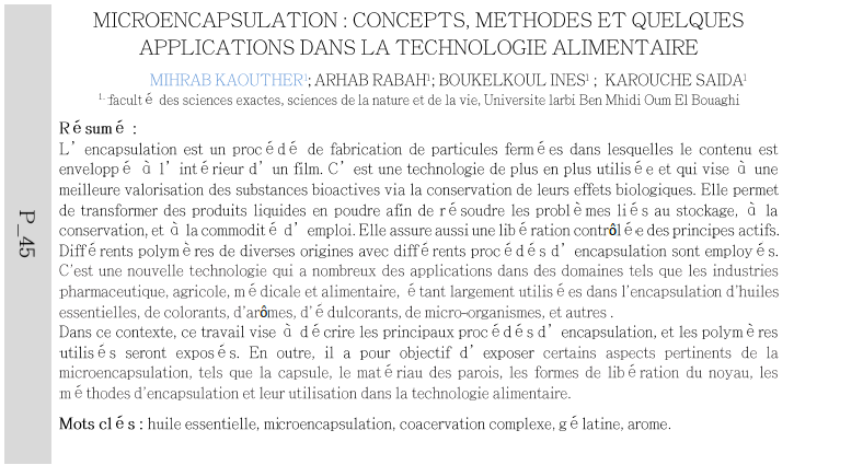 Dans ce contexte, ce travail vise à décrire les principaux procédés d' encapsulation, et les polymè res utilisés seront exposés. En outre, il a pour objectif d' exposer certains aspects pertinents de la microencapsulation, tels que la capsule, le matériau des parois, les formes de libération du noyau, les méthodes d'encapsulation et leur utilisation dans la technologie alimentaire