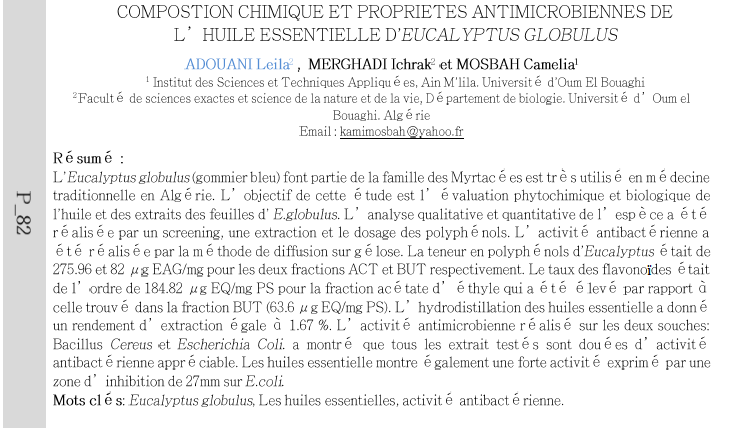 Compostion chimique et proprietes antimicrobiennes de l'huile essentielle d'eucalyptus globulus