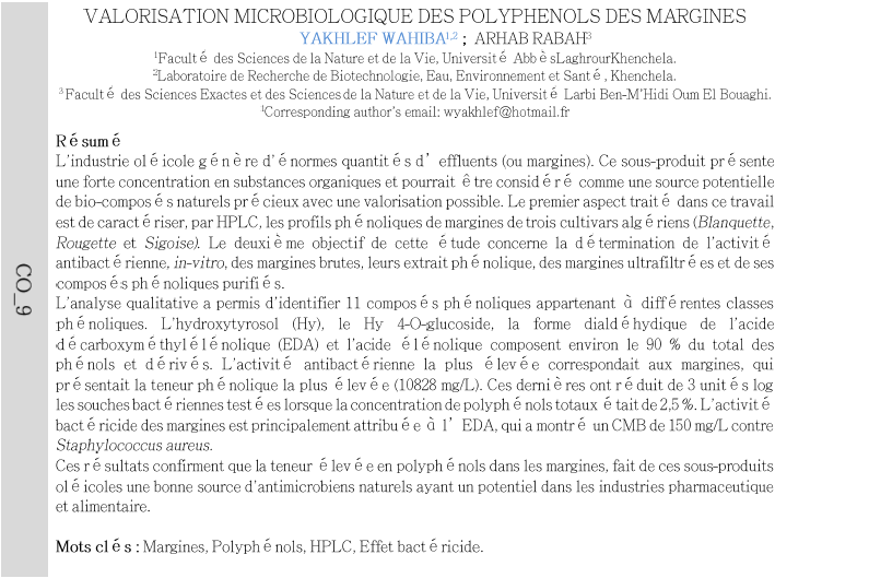 L'industrie ol é icole génère d'énormes quantités d' effluents (ou margines). Ce sous-produit présente une forte concentration en substances organiques et pourrait être considéré comme une source potentielle de bio-compos é s naturels précieux avec une valorisation possible. Le premier aspect traité dans ce travail est de caractériser, par HPLC, les profils ph é noliques de margines de trois cultivars algériens (Blanquette, Rougette et Sigoise). Le deuxième objectif de cette é tude concerne la détermination de l'activité antibactérienne, in-vitro, des margines brutes, leurs extrait phé nolique, des margines ultrafiltr é es et de ses compos és phénoliques purifi é s. L'analyse qualitative a permis d'identifier 11 composés phénoliques appartenant à différentes classes phénoliques. L'hydroxytyrosol (Hy), le Hy 4-0-glucoside, la forme diald é hydique de l'acide dé carboxyméthylélé nolique (EDA) et l'acide élé nolique composent environ le 90 % du total des phénols et dérivés. L'activité antibactérienne la plus élevée correspondait aux margines, qui présentait la teneur phénolique la plus élevée (10828 mg/L). Ces dernières ont réduit de 3 unit és log les souches bactériennes test é es lorsque la concentration de polyph é nols totaux était de 2,5%. L'activité bact é ricide des margines est principalement attribuée à l' EDA, qui a montré un CMB de 150 mg/L contre Staphylococcus aureus. Ces résultats confirment que la teneur élevé e en polyph é nols dans les margines, fait de ces sous-produits olé icoles une bonne source d'antimicrobiens naturels ayant un potentiel dans les industries pharmaceutique et alimentaire.