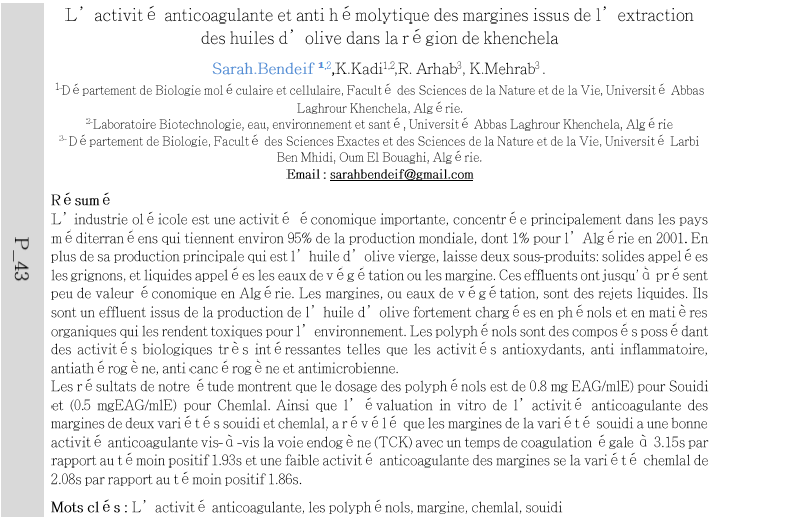L'activité anticoagulante et anti hé molytique des margines issus de l' extraction des huiles d' olive dans la région de khenchela