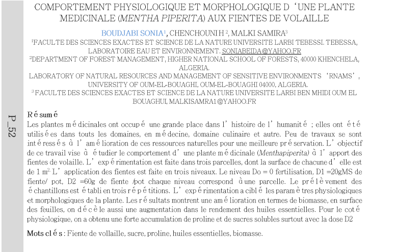Les plantes médicinales ont occupé une grande place dans l' histoire de l'humanité; elles ont été utilisé es dans touts les domaines, en médecine, domaine culinaire et autre. Peu de travaux se sont intéressés à l'amélioration de ces ressources naturelles pour une meilleure préservation. L' objectif de ce travail vise à étudier le comportement d' une plante médicinale (Menthapiperita) à l' apport des fientes de volaille. L' expérimentation est faite dans trois parcelles, dont la surface de chacune d' elle est de 1 m2 L' application des fientes est faite en trois niveaux. Le niveau Do = 0 fertilisation, D1 =20gMS de fiente/ pot, D2 =60g de fiente pot chaque niveau correspond à une parcelle. Le prélèvement des é chantillons est établi en trois répétitions. L' expérimentation a ciblé les paramè tres physiologiques et morphologiques de la plante. Les résultats montrent une amélioration en termes de biomasse, en surface des feuilles, on décè le aussi une augmentation dans le rendement des huiles essentielles. Pour le coté physiologique, on a obtenu une forte accumulation de proline et de sucres solubles surtout avec la dose D2.