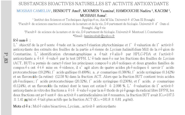 L'objectif de la présente étude est la caractérisation phytochimique et l'évaluation de l'activité antioxydante des extraits des feuilles de la partie aérienne de Lycium halimifolium Mill de la région de Constantine. L'identification chromatographique a était réalisé par HPLC-PDA et l'activité antioxydante a été évalué par le test DPPH. L'étude men é e sur les fractions des feuilles de Lycium (ACT, BUT) a permis de caractériser les principaux composé s phénoliques et deux grandes familles de composés ont été mise en évidence, il s'agit alors de quatre acides phénoliques à savoir l' acide protocatechique (19.29%), l' acide gallique (0.499%), a. p coumarique (0.386%), l' acide syringique (0.142%) et un flavonoide (la rutine) (12.58 %) dans la fraction ACT. Alors que la fraction BUT contient trois acides phénoliques; l' acide protocatechique (20.32%), 1' acide syringique (0.236%), et l' acide. coumarique (0.124%), et un flavonoïde (la rutine) dont le taux est estimé à 2.098 %. L'évaluation de l' activité antioxydante in vitro des fractions a été évaluée par la méthode de pi é geage du radical libre DPPH, les deux fractions ont présenté des activités antiradicalaires intéressantes, la fraction BUT avait IC-107.5 1.41 μg/ml et était plus actifs que la fraction ACT (IC50-181.8±0.81 μg/ml).