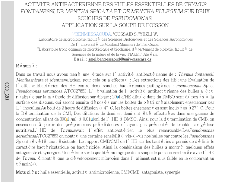 Activite antibacterienne des huiles essentielles de thymus fontanessi, de mentha spicata et de mentha pulegium sur deux souches de pseudomonas.
