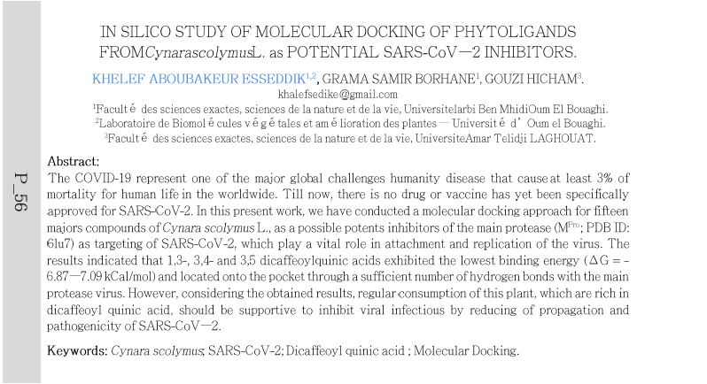 Cynara scolymus; SARS-CoV-2; Dicaffeoylquinic acid; Molecular Docking.