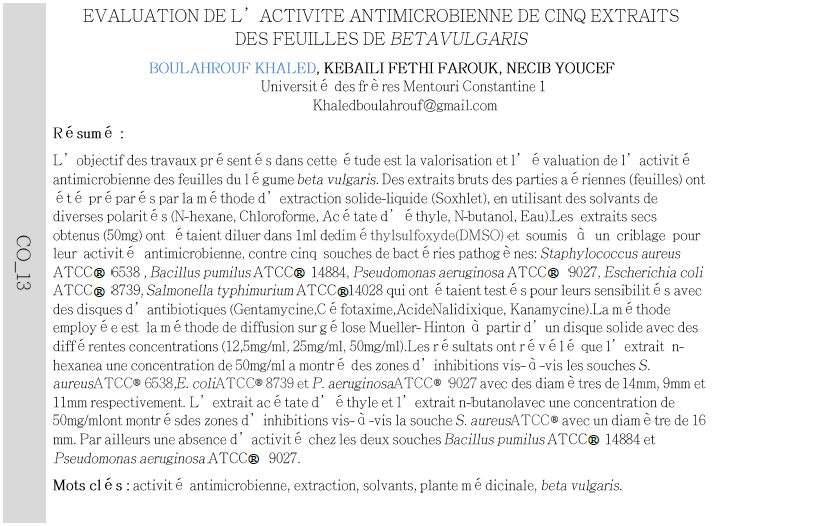 Activité antimicrobienne; Extraction; Solvants; Plante médicinale; Beta vulgaris.